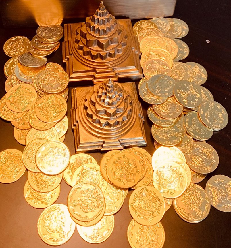 Ashtothara Lakshmi Kubera Coins (108 nos).These coins are made of copper with gold polish. One side of the coin has Kubera on one side and the powerful Sri Chakra Yantra on the other side.
